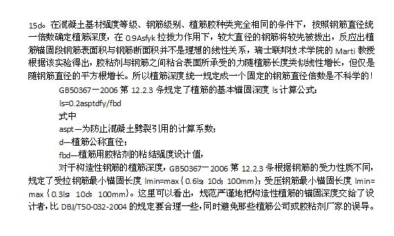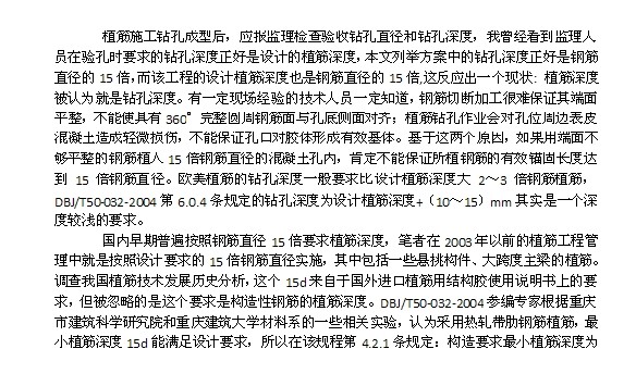植筋施工鉆孔成型后,應(yīng)報監(jiān)理檢查驗收鉆孔直徑和鉆孔深度,在驗孔時要求的鉆孔深度正好是設(shè)計的植筋深度,鉆孔深度正好是鋼筋直徑的15倍,而該工程的設(shè)計植筋深度也是鋼筋直徑的15倍,這反應(yīng)出一個現(xiàn)狀:植筋深度被認為就是鉆孔深度。有一定現(xiàn)場經(jīng)驗的技術(shù)人員一定知道,鋼筋切斷加工很難保證其端面平整,不能使具有360°完整圓周鋼筋面與孔底側(cè)面對齊;植筋鉆孔作業(yè)會對孔位周邊表皮混凝土造成輕微損傷,不能保證孔口對膠體形成有效基體;谶@兩個原因,如果用端面不夠平整的鋼筋植入15倍鋼筋直徑的混凝土孔內(nèi),肯定不能保證所植鋼筋的有效錨固長度達到15倍鋼筋直徑。歐美植筋的鉆孔深度一般要求比設(shè)計植筋深度大2~3倍鋼筋植筋,DBJ/T50-032-2004第6.0.4條規(guī)定的鉆孔深度為設(shè)計植筋深度+(10~15)mm其實是一個深度較淺的要求。