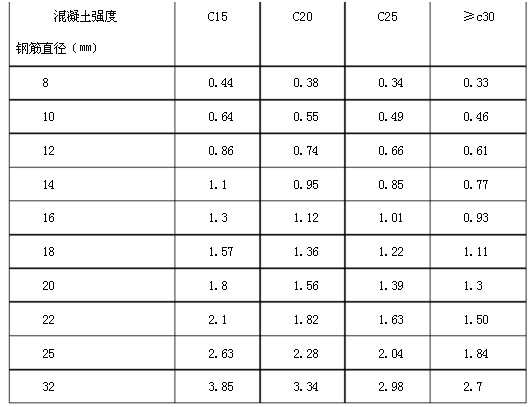注:1、當(dāng)混凝土強度等級不低于C40時,對抗剪強度最小值不低于21N/㎜2 的粘結(jié)劑,其植筋的系數(shù)a值乘以修正系數(shù)0.9。