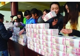 2014年1月15日 四川加固公司 四川涼山州冕寧縣復(fù)興鎮(zhèn)建設(shè)村召開(kāi) 2013年分紅大會(huì),分紅金額達(dá)1311.5萬(wàn)元,F(xiàn)場(chǎng),重達(dá)312斤的人民幣現(xiàn)金一捆捆整齊地放在臺(tái)上,340余戶(hù)入股村民排隊(duì)領(lǐng)錢(qián),最多的一戶(hù)領(lǐng)到了30萬(wàn)元,最少的也有近萬(wàn)元,數(shù)錢(qián)數(shù)到手都軟了。村上分紅金額最多的,是村民金鷗,他領(lǐng)到了30萬(wàn)元。“天冷,數(shù)了半天,手都數(shù)軟了,都還沒(méi)有數(shù)清楚!卑彦X(qián)放進(jìn)袋子里,金鷗甩著手說(shuō)。