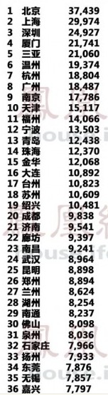 2014年1月全國(guó)城市房?jī)r(jià)排行榜前10名分別是北京、上海、深圳、廈門(mén)、三亞、溫州、杭州、廣州、南京、天津。北京還是居于榜首,而南方城市廈門(mén)迎頭趕上位于第四的位置。從1月全國(guó)房?jī)r(jià)排行榜前100名單可知,1月全國(guó)城市房?jī)r(jià)排行榜前10名分別是北京、上海、深圳、廈門(mén)、三亞、溫州、杭州、廣州、南京、天津。福州房?jī)r(jià)以14066元/平方米,位居全國(guó)第11,同比上漲15.48%。不少網(wǎng)友悲嘆:房?jī)r(jià)直漲何時(shí)才能買(mǎi)得起房啊!