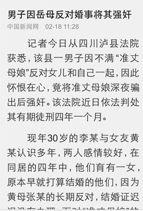 56網(wǎng) 【男子不滿準岳母反對女兒婚事 深夜將其騙出強奸】李某與女友黃某已經(jīng)同居四年,并育有一女,但因為黃母的長期反對,遲遲沒有領(lǐng)結(jié)婚證,因此懷恨在心。某日深夜李某以外出幫忙搬輪胎為由,將黃母騙到鄉(xiāng)下一間舊廠房內(nèi)后強奸,法院近日依法判處李某有期徒刑四年一個月。(轉(zhuǎn)自網(wǎng)絡(luò)) [查看圖片]