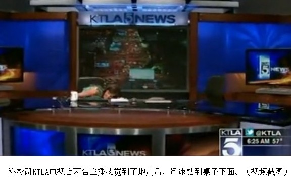 3月17日美國加州洛杉磯于當(dāng)?shù)貢r(shí)間17日發(fā)生里氏4.4級地震。洛杉磯KTLA電視臺的兩名主播當(dāng)時(shí)正在做電視直播。抗震加固公司:在地震來襲的一剎那,男主播朔伊布勒反應(yīng)靈敏,在露出驚恐的表情后,同女主播一起鉆到了桌子下面,這一幕被正在直播的攝影機(jī)抓了個(gè)正著。地震發(fā)生在當(dāng)?shù)貢r(shí)間17日6點(diǎn)25分(北京時(shí)間21點(diǎn)25分),當(dāng)時(shí)朔伊布勒正和女主播一起播報(bào)早間新聞。地震來臨時(shí),朔伊布勒露出了驚恐的表情,然后喊道:“是地震,我們遭遇了地震!”然后他反射性的跳起來,同身旁的女主播一起鉆到桌子底下。