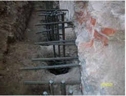 樹根樁是一種小型鉆孔灌注樁,直它是利用小型鉆機按設計直徑,鉆進至設計深度,然后放入鋼筋籠,同時放入灌漿管,注入水泥漿或水泥砂漿,結合碎石骨料成樁。樹根樁可以根據(jù)需要,做成垂直的,也可以是傾斜的,可以是單根的,也可以是成束的,可以是端承樁,也可以是摩擦樁。